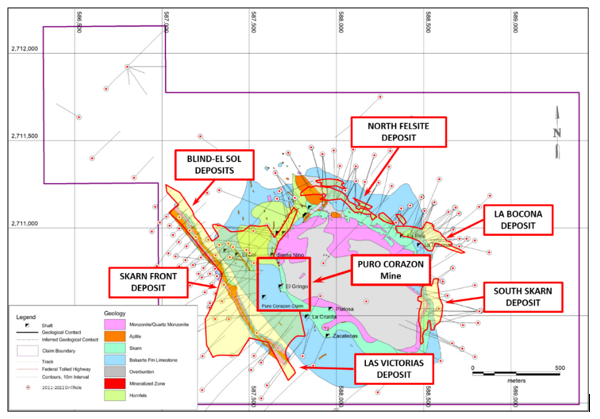 Figure 2: Projected Puro Corazon drill targets within the Skarn Front and Blind-El Sol block models with proposed the drill pattern for Q4 drilling on the Puro Corazon claim
