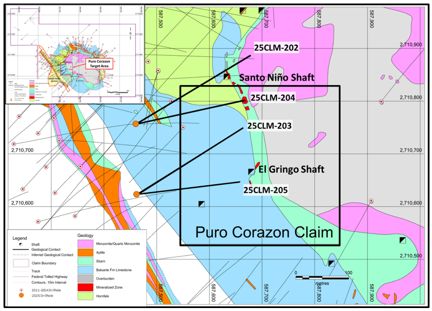 The highlight interval is a 65 metre step-out from previously reported Bonanza-silver mineralization in drill hole 25CLM-203 which returned 10.5 metres averaging 1,115g/t AgEq (see NR-16-26; Dec. 1, 2025). Both mineralized intervals exhibit a similar replacement-style of mineralization, are located on the outer edge of the main skarn zone and may form part of a high-grade hanging wall Carbonate-Replacement (CRD) zone outboard of the historic Puro Corazon workings.