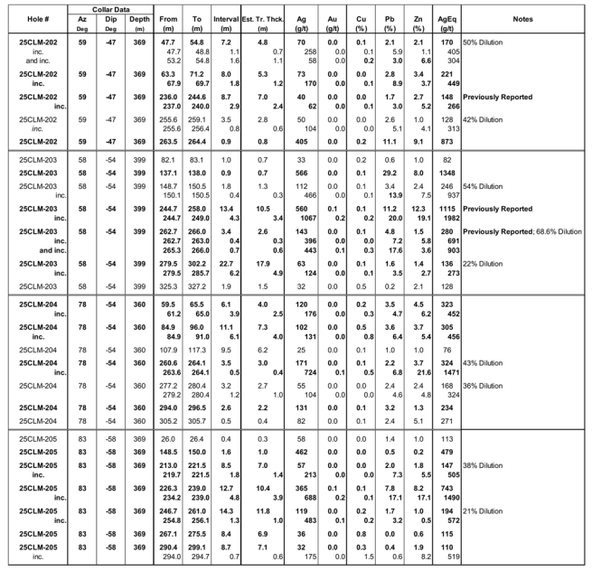 - a 10.4 metre interval averaging 365g/t Ag, 0.1g/t Au, 0.1% Cu, 7.8% Pb and 8.2% Zn(743g/t AgEq), including a 3.9 metre interval averaging 688g/t Ag, 0.2g/t Au, 0.1% Cu, 17.1% Pb and 17.1% Zn (1,490g/t AgEq)(1) from drillhole 25CLM-205