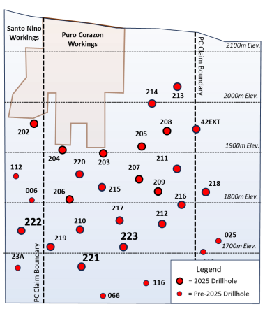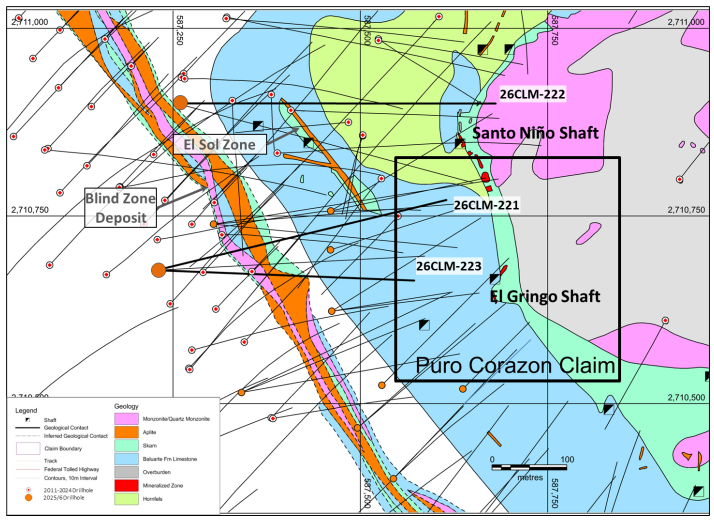 Vice President of Exploration, Rob Macdonald stated “ The 2025-26 drill program successfully outlined and upgraded mineralization on the Puro Corazon claim; extending mineralization within the skarn-altered halo around the main intrusion for upwards of 400 metres laterally and to depths of up to 500 metres below surface, where it transitions into previously identified mineralization in the larger CLM claim block. More significantly, drilling also intersected multiple bonanza-grade, replacement-styled intercepts on the outer edge of the skarn-altered halo, potentially forming a shallow high-grade lens outboard of the main skarn zone and starting within 200 metres of surface. This mineralization is adjacent to existing historical mine workings and could be accessed early in a mine plan scenario.”