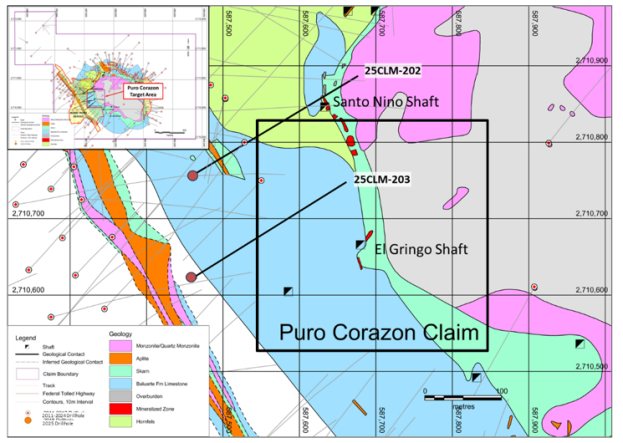 Assays from drill hole 25CLM-202 were also received and identified mineralized skarn located adjacent to the historic Santo Nino workings which are located to the north of the Puro Corazon claim boundary and on the larger CLM property. Highlights include: