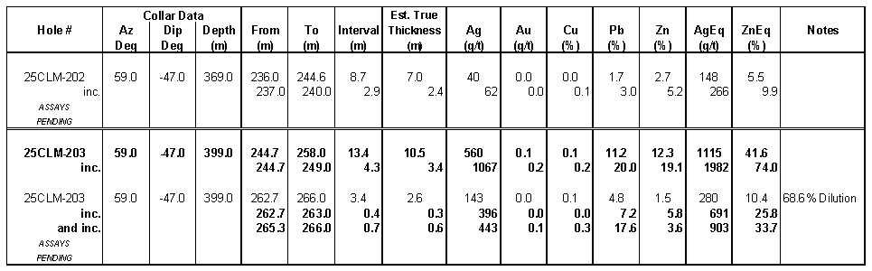 The replacement interval contains semi-massive to massive sulphides with up to 40% sphalerite (zinc), 30% galena (lead) and lesser pyrite with silver mineralization most strongly correlated to the galena content and represents a carbonate replacement hosted in limestone sitting outside of the main skarn zone and the historic Puro Corazon workings. Several additional mineralized zones were intersected deeper in drill hole 25CLM-203 including intervals of variably mineralized skarn. The intervals have been sampled and submitted for analyses; assays remain pending and will be released upon receipt.