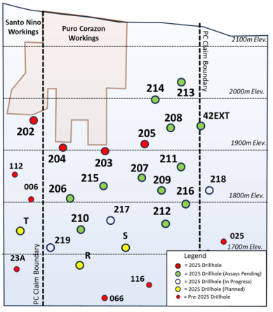 The highlight interval is a 65 metre step-out from previously reported Bonanza-silver mineralization in drill hole 25CLM-203 which returned 10.5 metres averaging 1,115g/t AgEq (see NR-16-26; Dec. 1, 2025). Both mineralized intervals exhibit a similar replacement-style of mineralization, are located on the outer edge of the main skarn zone and may form part of a high-grade hanging wall Carbonate-Replacement (CRD) zone outboard of the historic Puro Corazon workings.