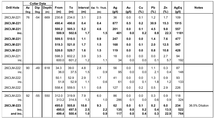 - a 4.6 metre interval averaging201g/t Ag, 0.1%g/t Cu, 4.5 % Pb and 9.8 % Zn (557g/t AgEq),includinga 1.5 metre interval averaging 401g/t Ag, 0.2% Cu, 8.9 % Pb and 22.3 % Zn (1181g/t AgEq) (1) from drillhole 26CLM-221; and